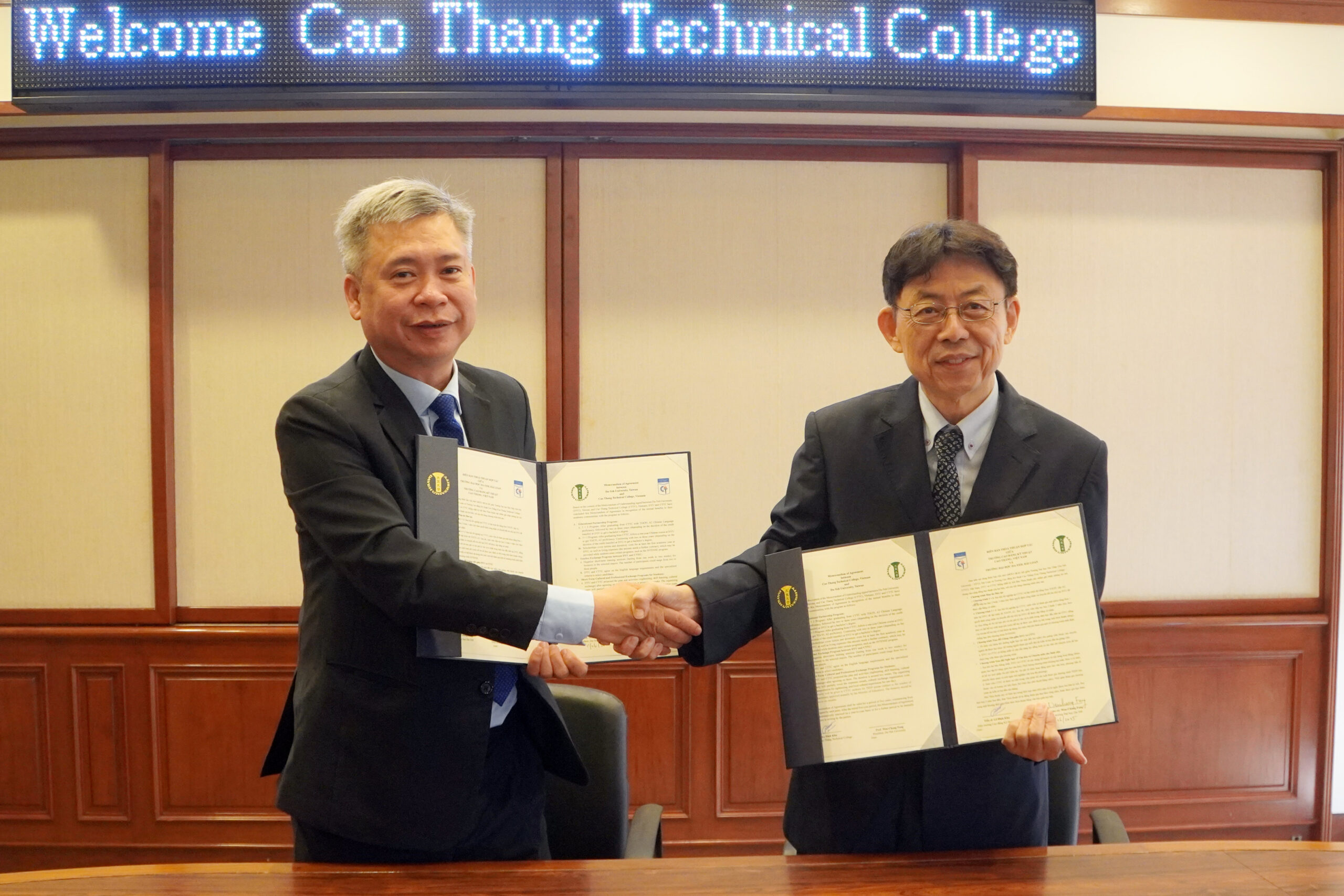 ▲越南高升高專黎廷嘉校長(左)與大葉大學方文昌校長(右)代表雙方簽立合作協議